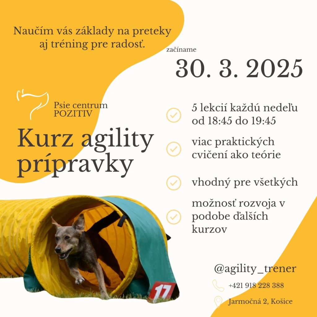 Chcete, aby váš pes bol pripravený na nadchádzajúcu agility sezónu? Chcete zdokonaliť základné zručnosti, posilniť samostatnosť psa a naučiť sa presne rozlišovať povely na prekážkach? Potom je náš intenzívny tréning „Agility: Sezónny Restart“ určený práve pre vás!